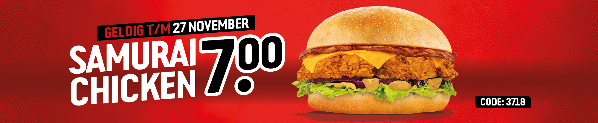 Burger met Samurai-saus, rode ui, sla, Crispy Chicken, Cheddar en (kalkoen) Bacon, een drankje en een bijgerecht naar keuze